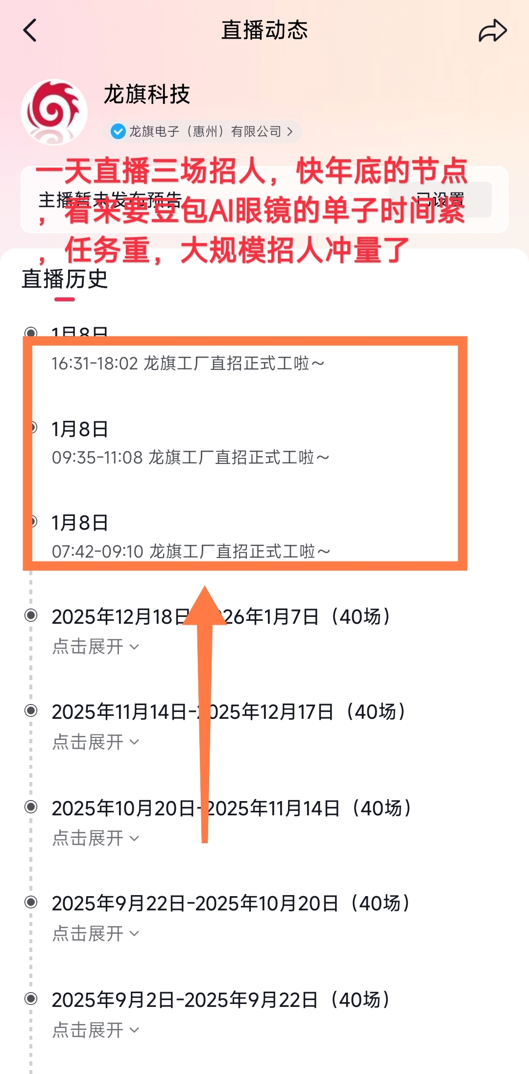 $龙旗科技(SH603341)$ 龙旗科技官方直播号,一天直播三场招人,应该是要往春节前卡节点,看来豆包AI眼镜的单子时间紧、任务重,大规模招人冲量了