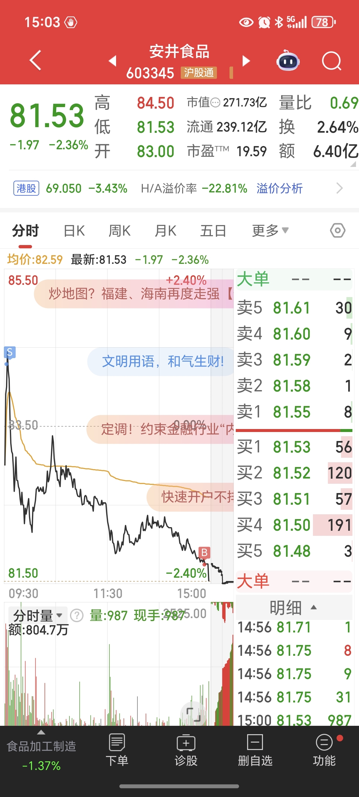 $安井食品(SH603345)$ 看看早上冲高不对劲,跑了1/3仓,尾盘一路向下,想了下再加回来
