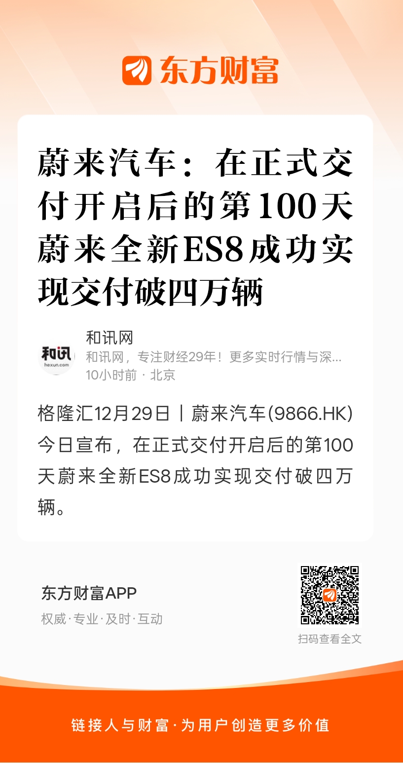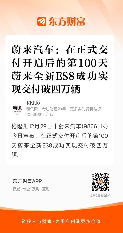 格隆汇12月29日|蔚来汽车(9866.HK)今日宣布,在正式交付开启后的第100天蔚来全新ES8成功实现交付破四万辆。