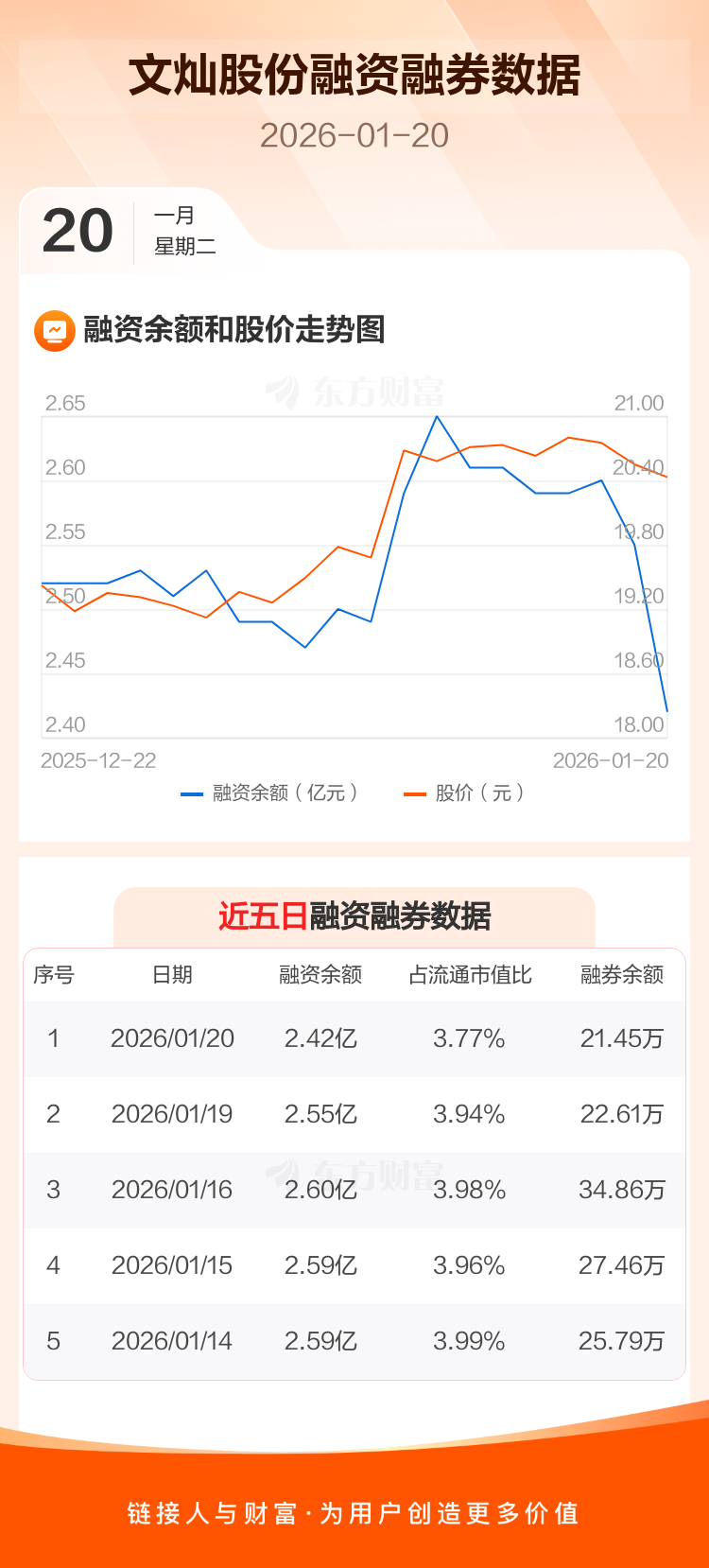交易所最新数据显示,文灿股份于2026年1月20日获融资买入594.48万元,融资偿还1808.16万元,当日融资净偿还1213.68万元。目前,该股融资余额2.42亿,占流通市值比例为3.77%。