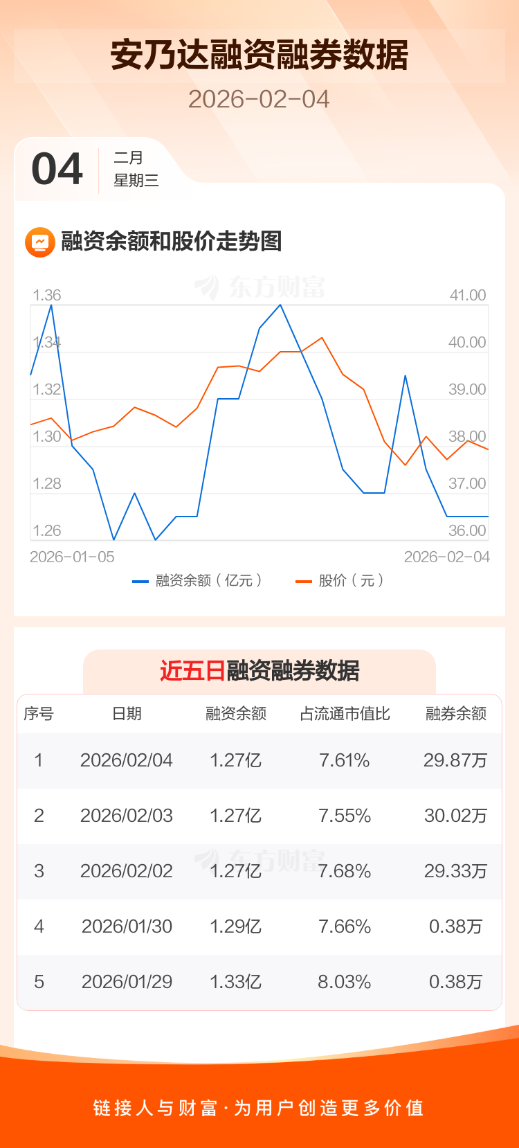交易所最新数据显示,安乃达于2026年2月4日获融资买入392.29万元,融资偿还356.69万元,当日融资净买入35.61万元。目前,该股融资余额1.27亿,占流通市值比例为7.61%。