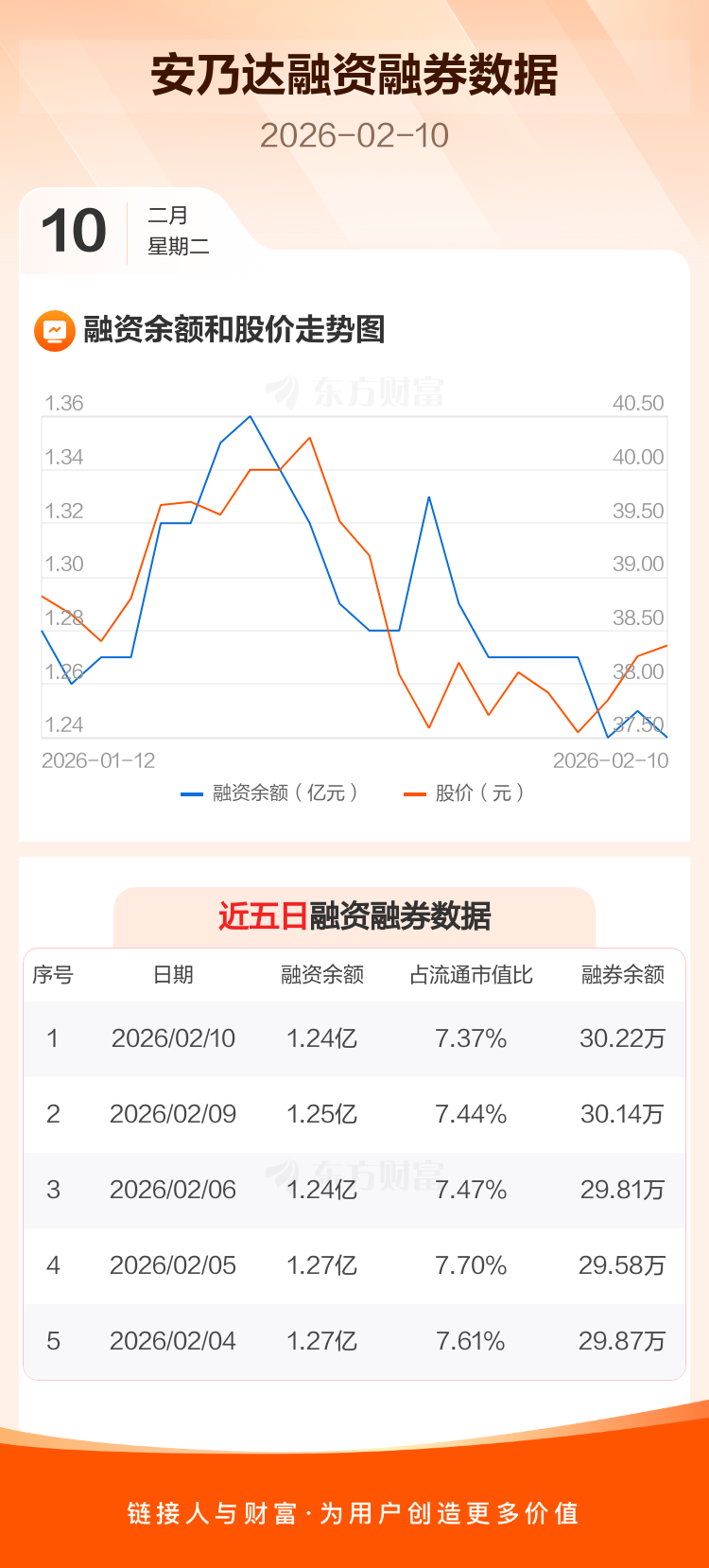 交易所最新数据显示,安乃达于2026年2月10日获融资买入350.24万元,融资偿还431.12万元,当日融资净偿还80.88万元。目前,该股融资余额1.24亿,占流通市值比例为7.37%。