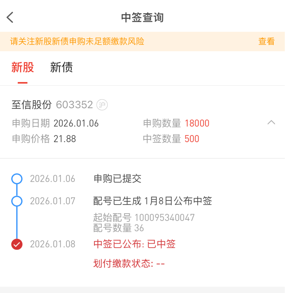 $至信股份(SH603352)$ 好几年中了一签,新年好运开启
