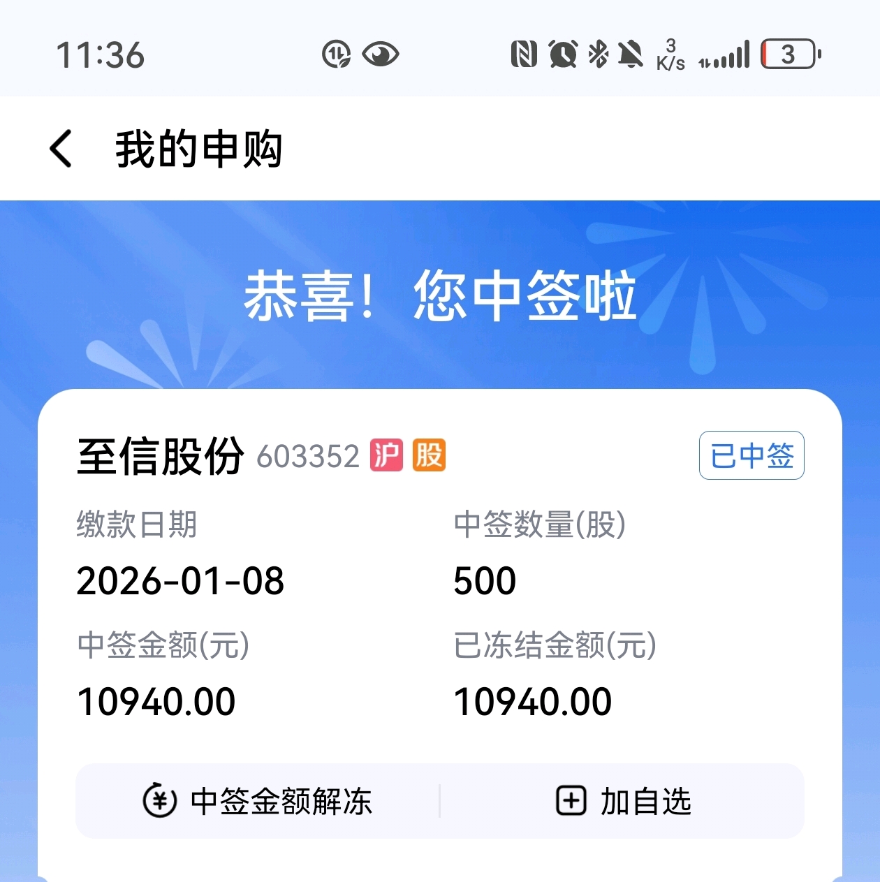 $至信股份(SH603352)$ 中了500