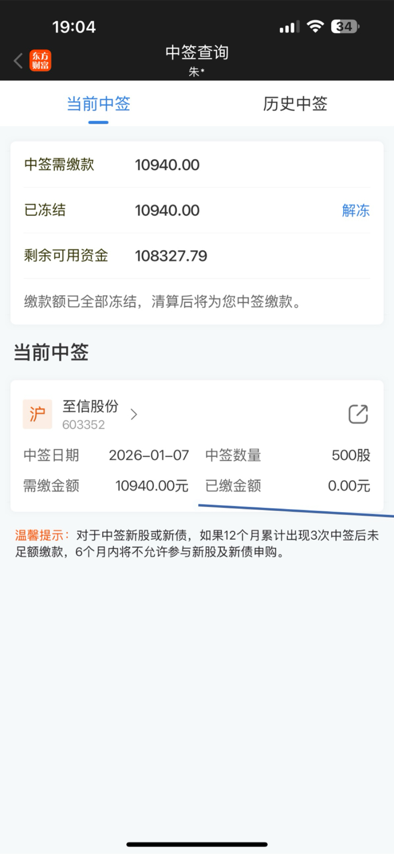 $至信股份(SH603352)$ 好不容易中一次,账户也有钱了,就没管,我看这里显示什么冻结,然后下面还没有缴费!不是吧,救命啊
