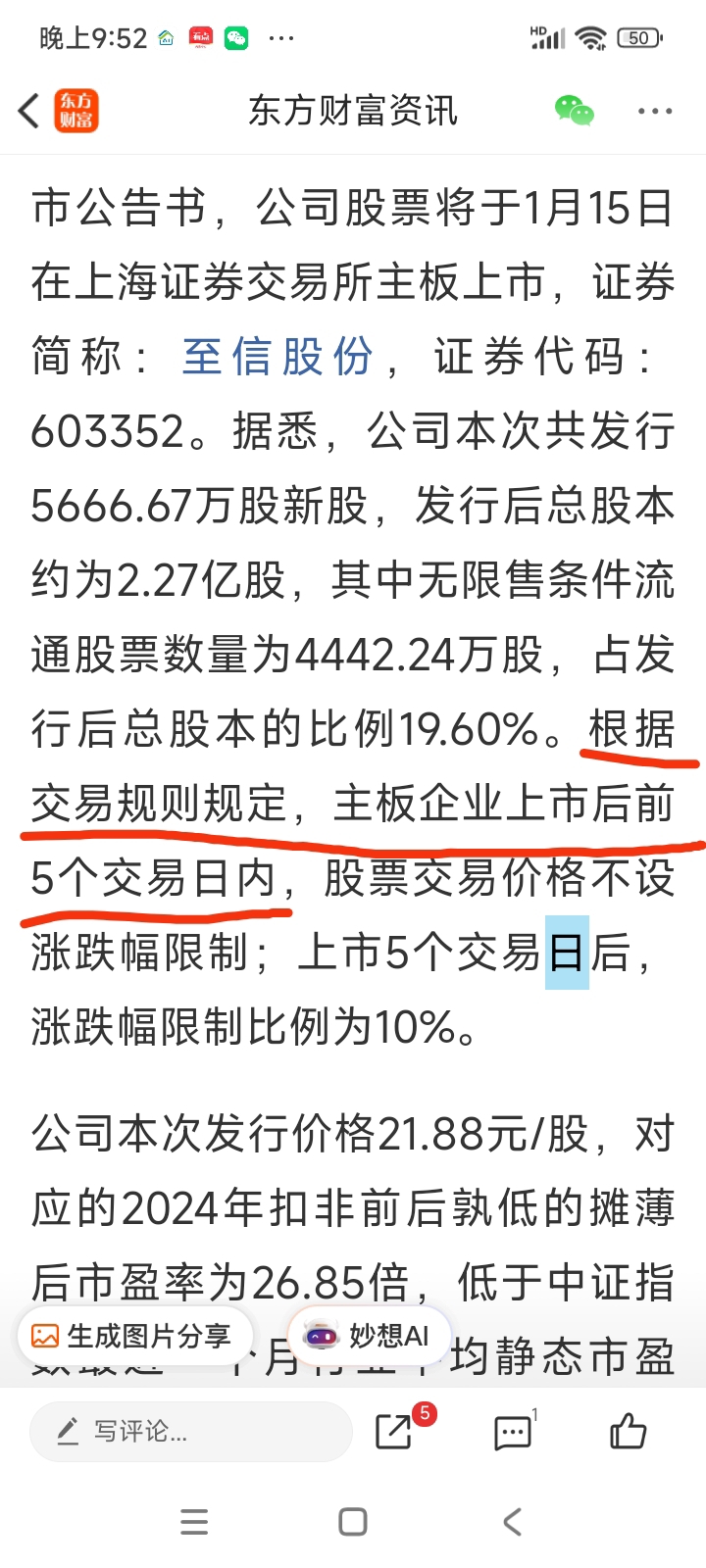 $至信股份(SH603352)$ 上市5天内涨跌不设限制吗?