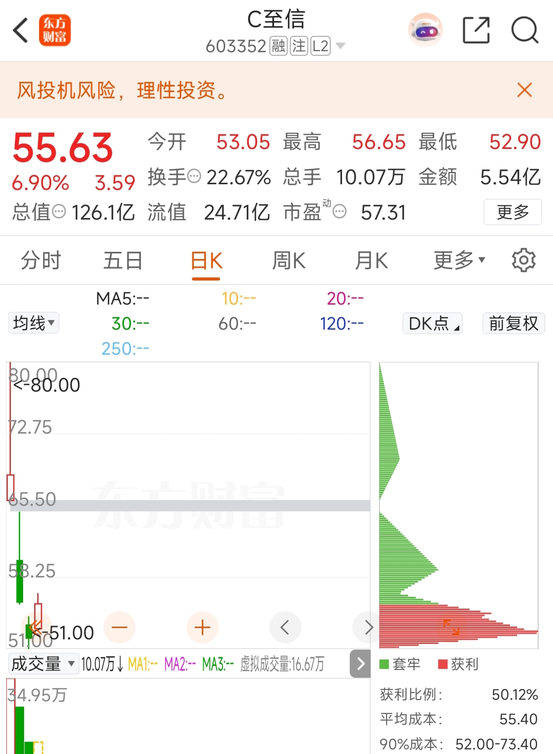 $C至信(SH603352)$ 换手太厉害了,上周五还是0获利盘,现在50%了