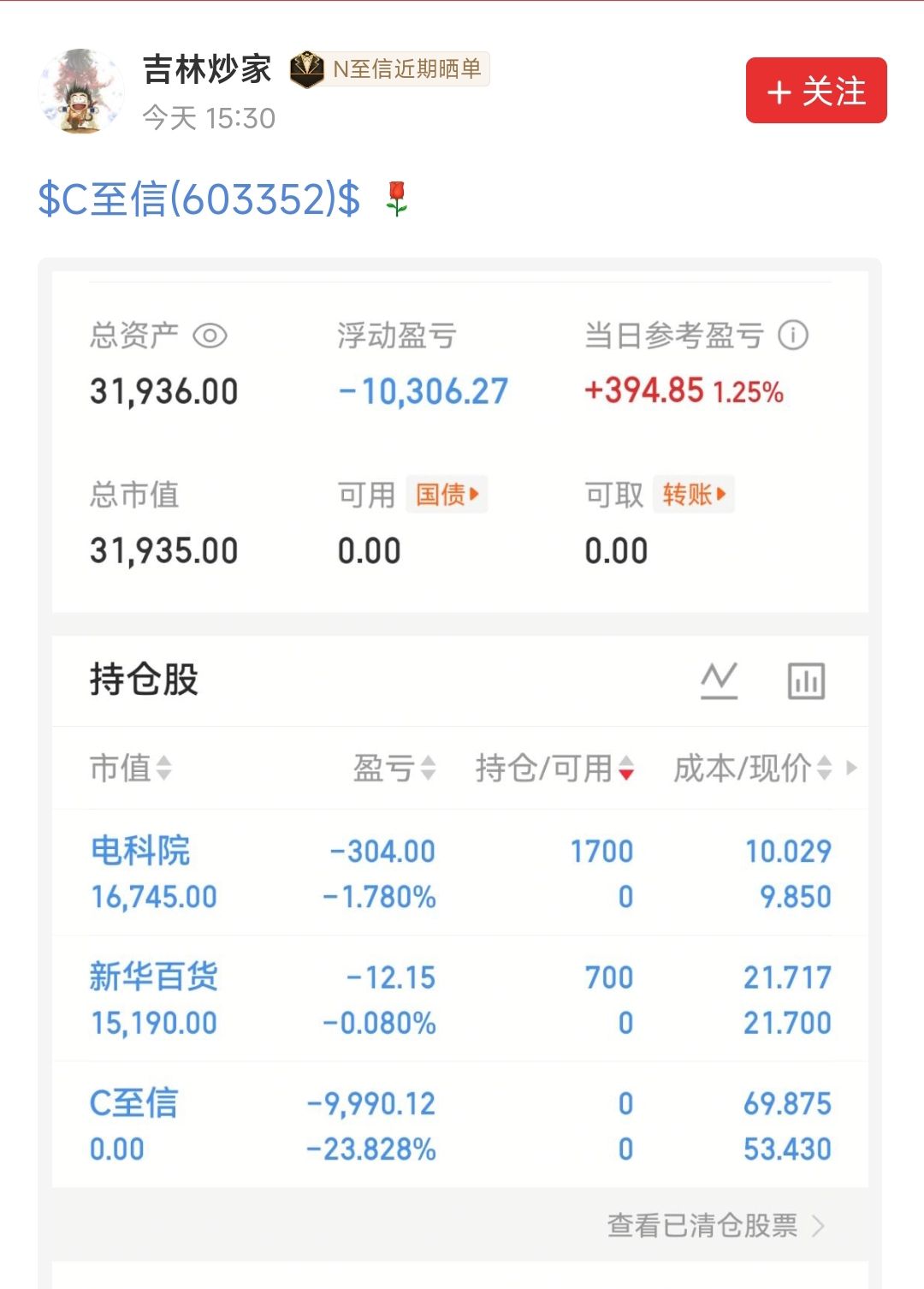 $C至信(SH603352)$ 最后的多头割肉一万跑了