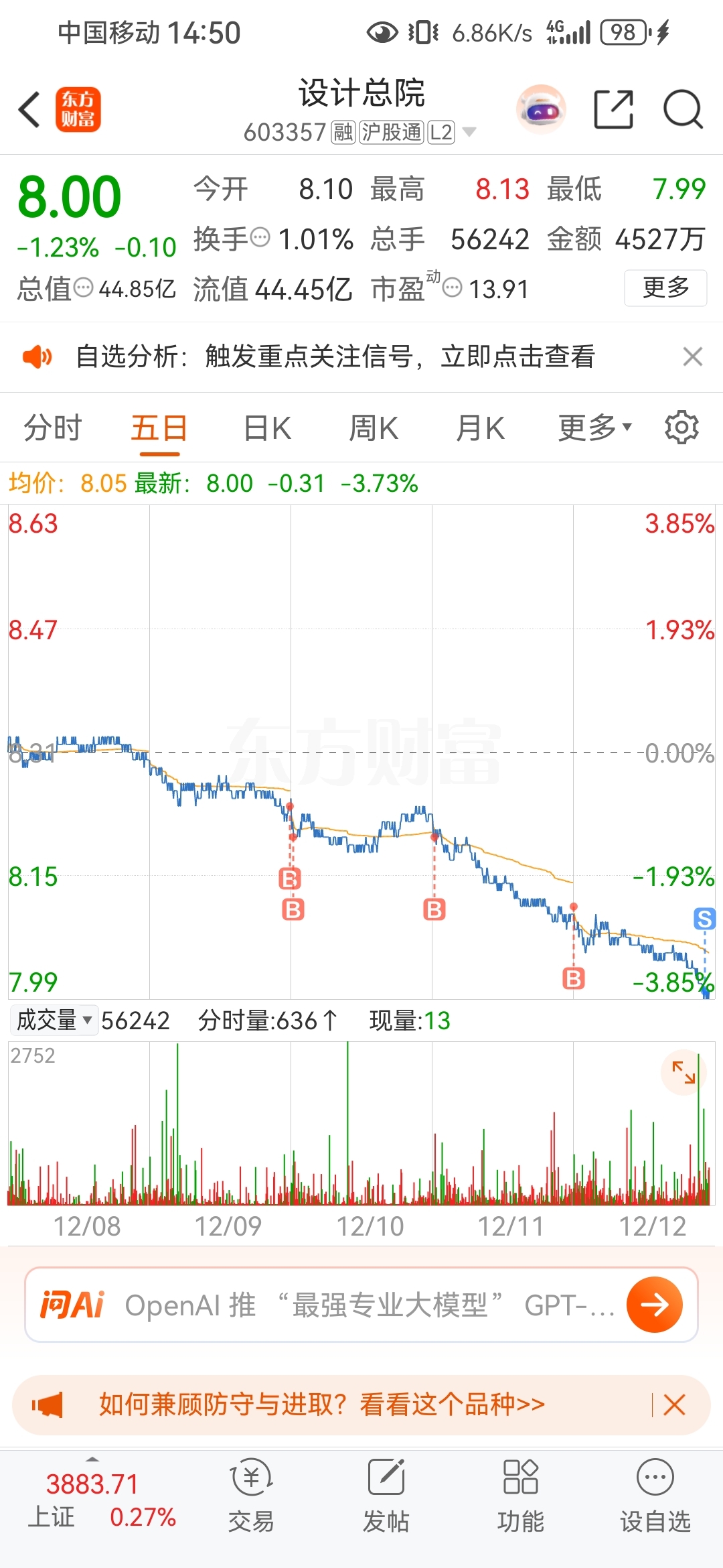 $设计总院(SH603357)$ 这垃圾一个月赚的全赔出去了