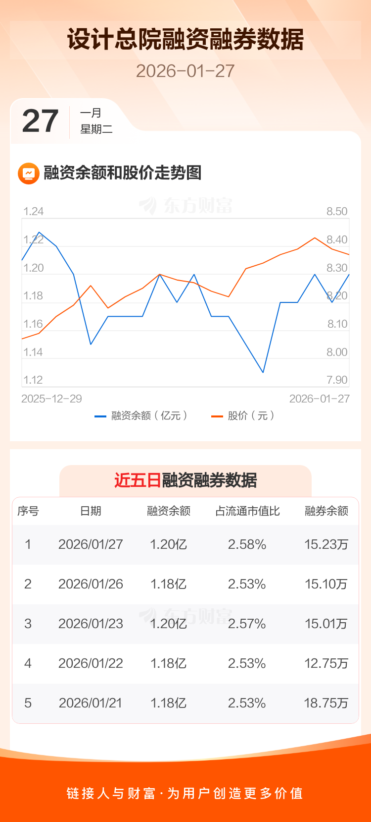 交易所最新数据显示,设计总院于2026年1月27日获融资买入298.71万元,融资偿还123.06万元,当日融资净买入175.65万元。目前,该股融资余额1.20亿,占流通市值比例为2.58%。