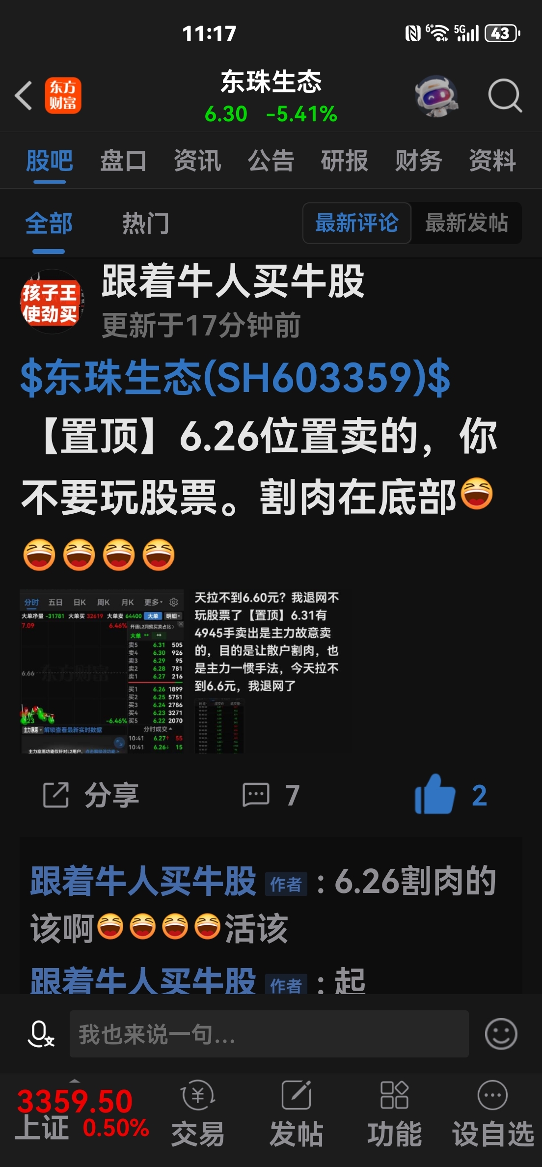 $东珠生态(SH603359)$ 6.26割肉的快买回(拉红是唯一真理)该股跌了40%没有利空,主力今天必须自救