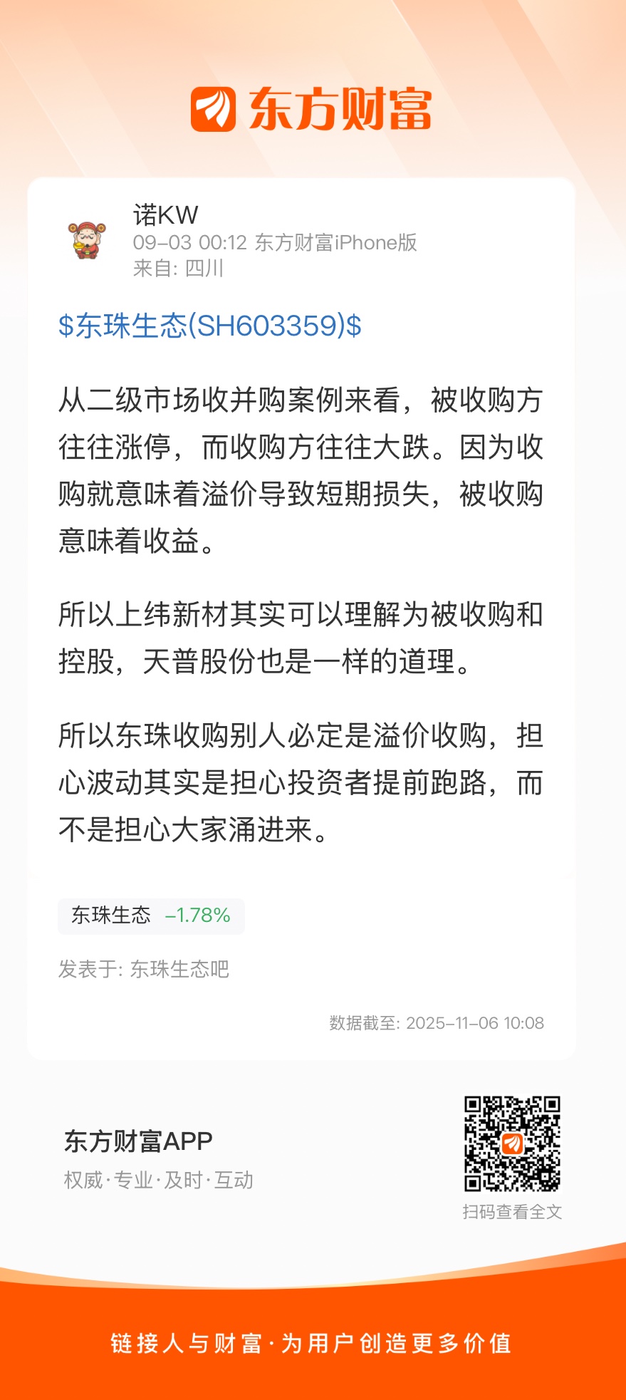 所以东珠收购别人必定是溢价收购,担心波动其实是担心投资者提前跑路,而不是担心大家涌进来。