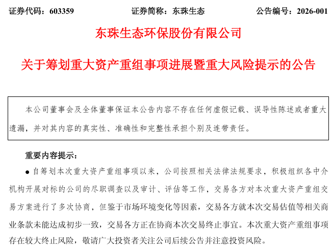 东珠生态(603359)1月9日公告,公司正在筹划以发行股份及支付现金的方式收购凯睿星通信息科技(南京)股份有限公司(简称“凯睿星通”)的控制权,同时拟募集配套资金。自筹划重大资产重组事项以来,公司严格按照相关法律法规要求,积极稳步推进本次重大资产重组包括审计和评估在内的各项工作。但鉴于市场环境变化等因素,交易各方就本次交易估值等相关商业条款未能达成初步一致,交易各方正在协商本次交易终止事宜。本次重大资产重组事项存在较大终止风险,后续公司及交易对手方将及时推进办理终止本次交易的相关事宜。
