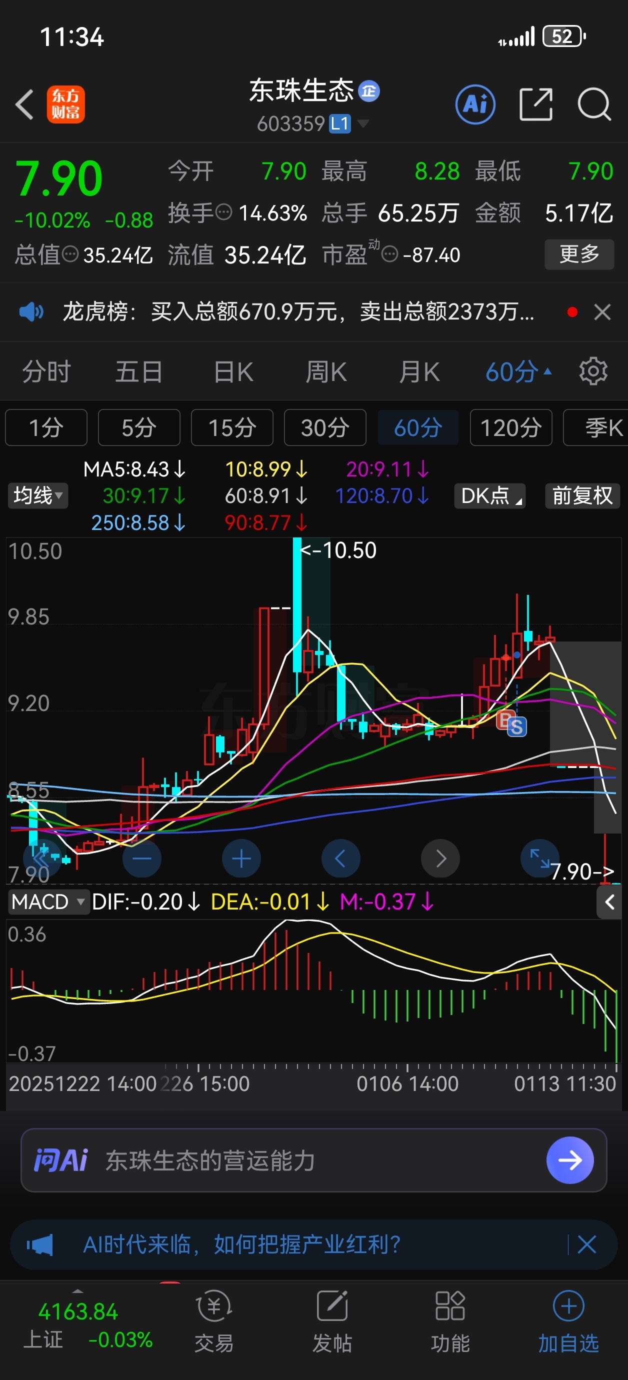 $东珠生态(SH603359)$ 太险了,跑太早没赚,也是万幸,亏个手续费。