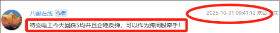 特变电工作为上周的跨周金谷,昨天让补仓,那么今天盘中八哥会给出新的观点,同时今天八哥会重新布局一支不输于特变电工这样的大肉,特变上周五八哥预判15个点,那么今天的金谷不会比特变差。有什么问题都可以在留言区留下足迹,八哥看到都会回复。相互探讨,相互成就,不要做潜水员,还有很多老铁总是发出疑问哪里能牵手,都不认真看文章,也不发表言论,这让八哥该如何跟老铁互动呢?老话说得好,机会是留给有准备和愿意分享,乐意观察的人!