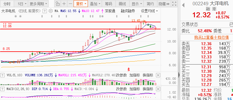 大洋电机:(电机)作为全球电机及驱动系统领域龙头企业,大洋电机不仅覆盖家电与家居电机、新能源汽车动力,还涉及氢燃料电池及储能系统等板块,构建了“电机+电控+电池”的全产业链布局,目前在机器人板块附加带动刺激下,股价气势如虹,近期高位持续缩量调整,下方二十日线支撑也是较为明显的,昨天的低开高走,给到短期止跌反弹动作,今天有望持续上攻,可以参考下方12块的强支撑,在分时均下方考虑低吸。