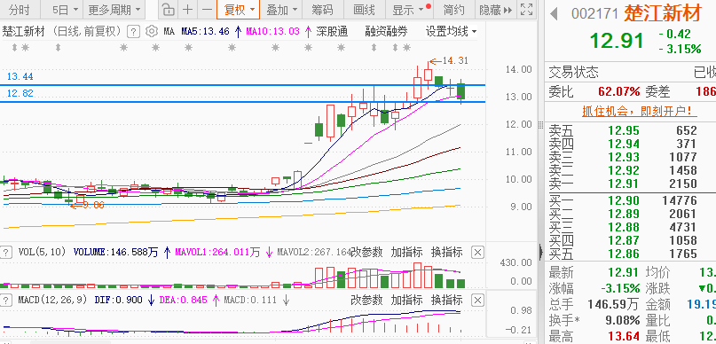 楚江新材:昨天早上小幅高开假动作,全天高开低走,一下子给到不少压力,一是下方支撑再次得到前面平台支撑验证,二是量能依旧维持平量状态持续筑底,早盘分时的量价背离是早上持续看多信号,板块上也有支撑,早盘依旧窗口下方12块8左右的平台支撑,反之要走人了。