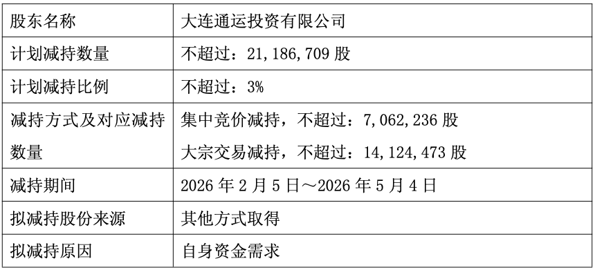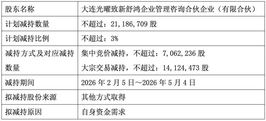 大连光曜致新舒鸿企业管理咨询合伙企业(有限合伙)(以下简称“光曜致新”)因自身资金需要,计划减持公司股份不超过21,186,709股,即不超过公司总股本的3%。其中,拟通过集中竞价交易方式减持不超过7,062,236股,拟通过大宗交易方式减持不超过14,124,473股。