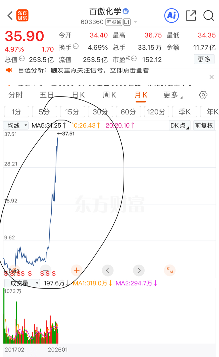$百傲化学(SH603360)$ 这个月线看起来好吓人, 90度笔直的往上涨。现在买入真的是刀口添血。风险非常大