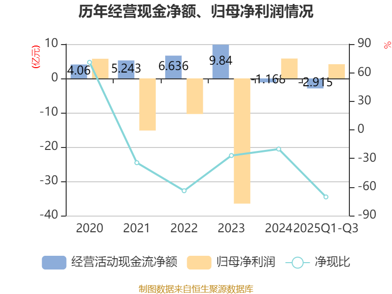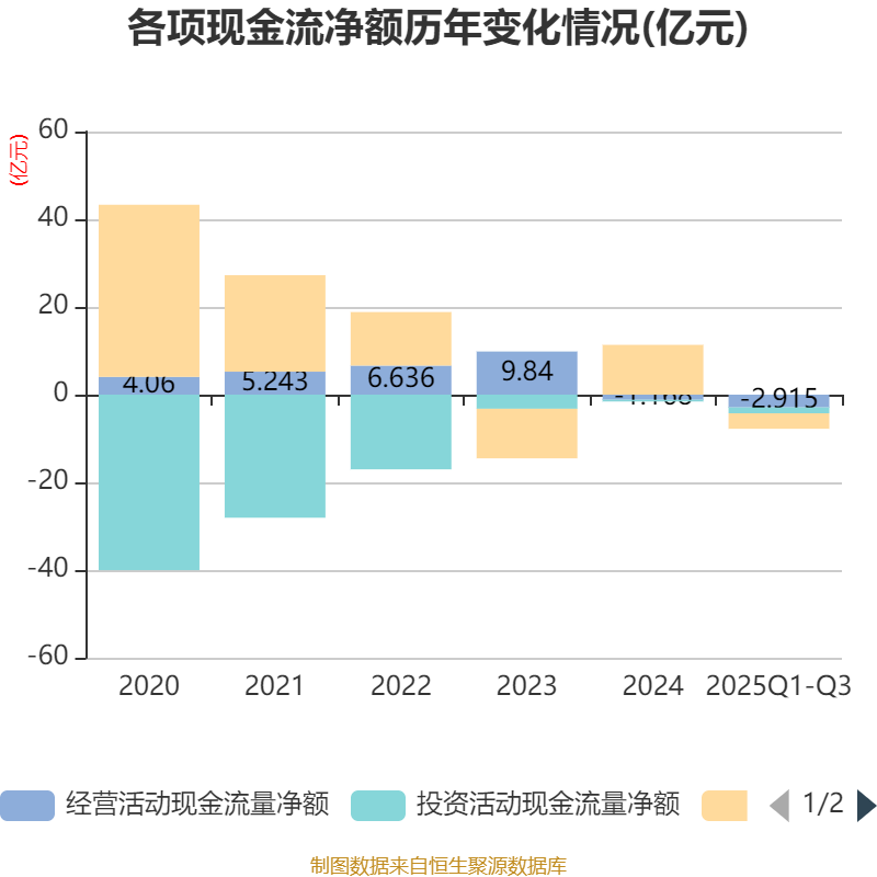 2025年前三季度,公司经营活动现金流净额为-2.91亿元,同比减少4.47亿元;筹资活动现金流净额-3.54亿元,同比减少4.04亿元;投资活动现金流净额-1.34亿元,上年同期为-2188.49万元。