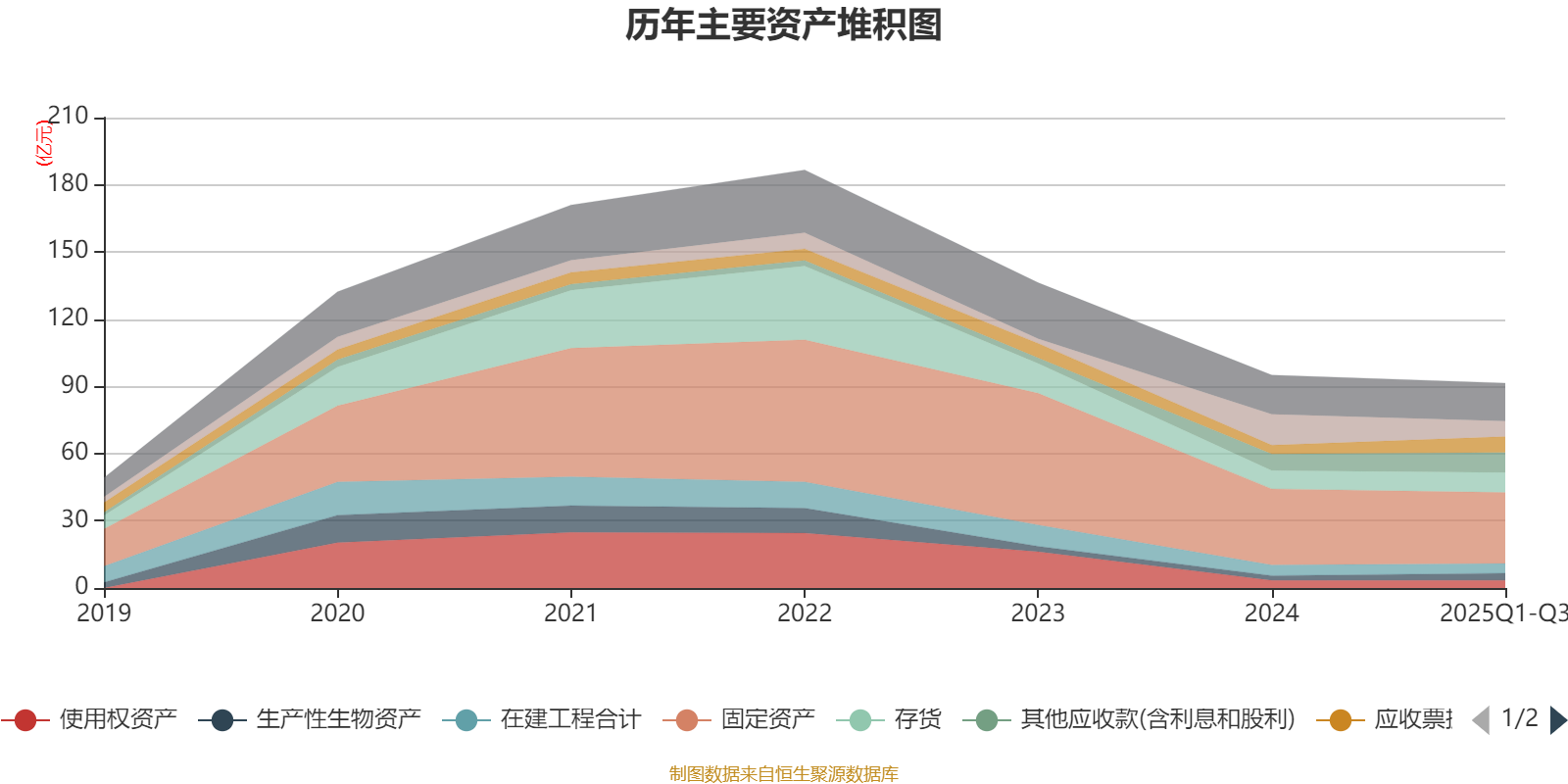 资产重大变化方面,截至2025年三季度末,公司货币资金较上年末减少49.64%,占公司总资产比重下降6.94个百分点;应收票据及应收账款较上年末增加79.81%,占公司总资产比重上升3.59个百分点;其他应收款(含利息和股利)较上年末增加21.54%,占公司总资产比重上升2.04个百分点;生产性生物资产较上年末增加49.29%,占公司总资产比重上升1.24个百分点。