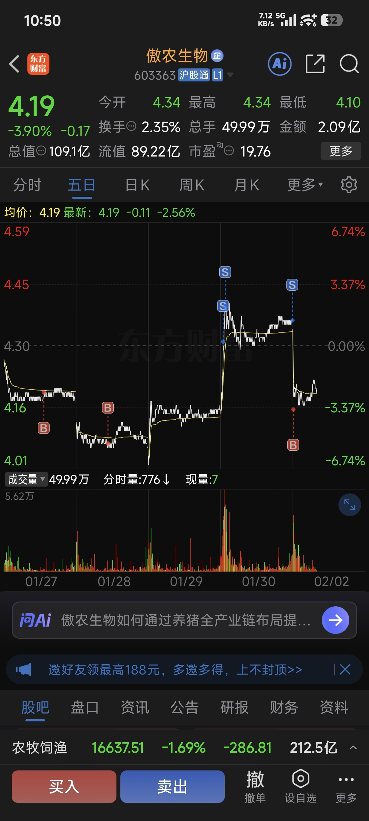 $傲农生物(SH603363)$ 卖涨买跌