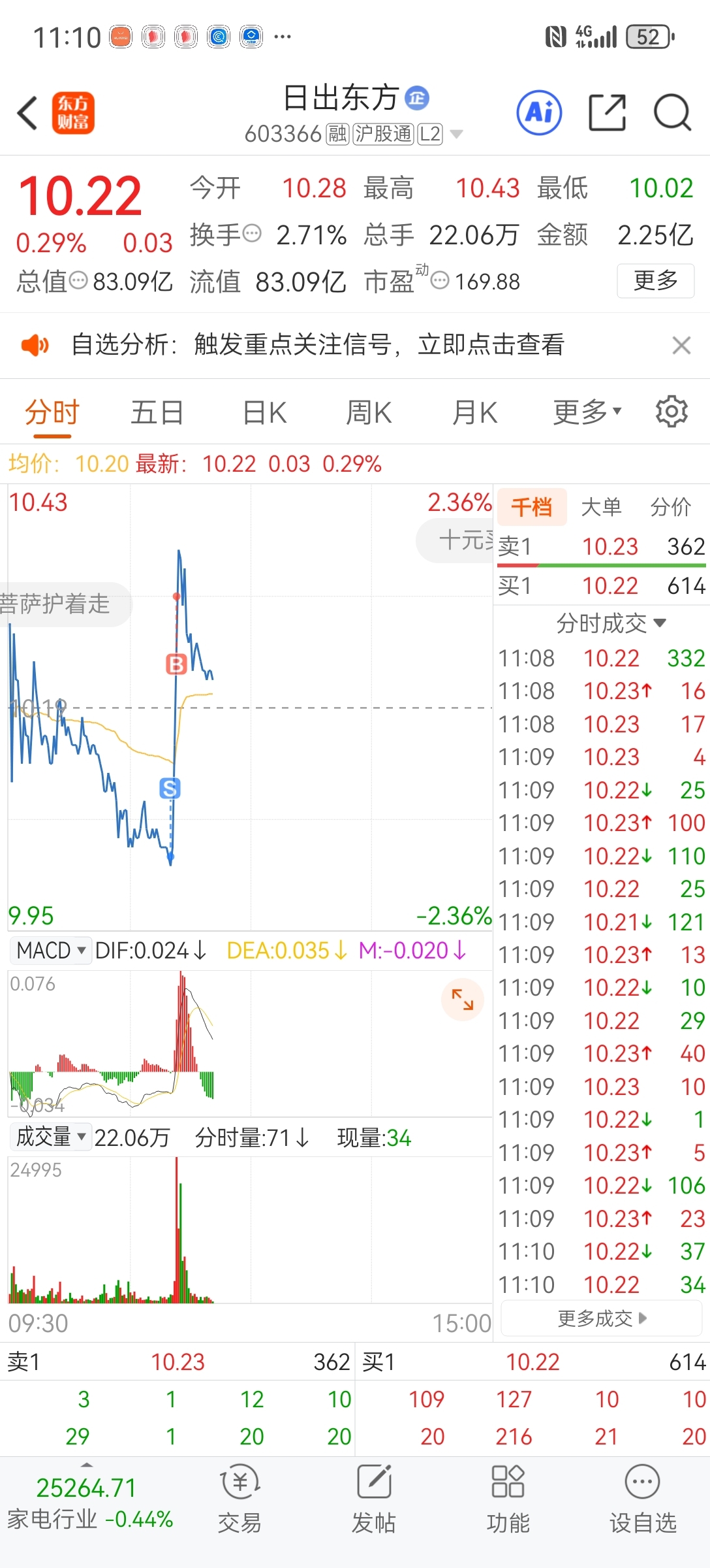 $日出东方(SH603366)$ 主力大哥,就差我这几十手吗?卖了不到5秒就拉