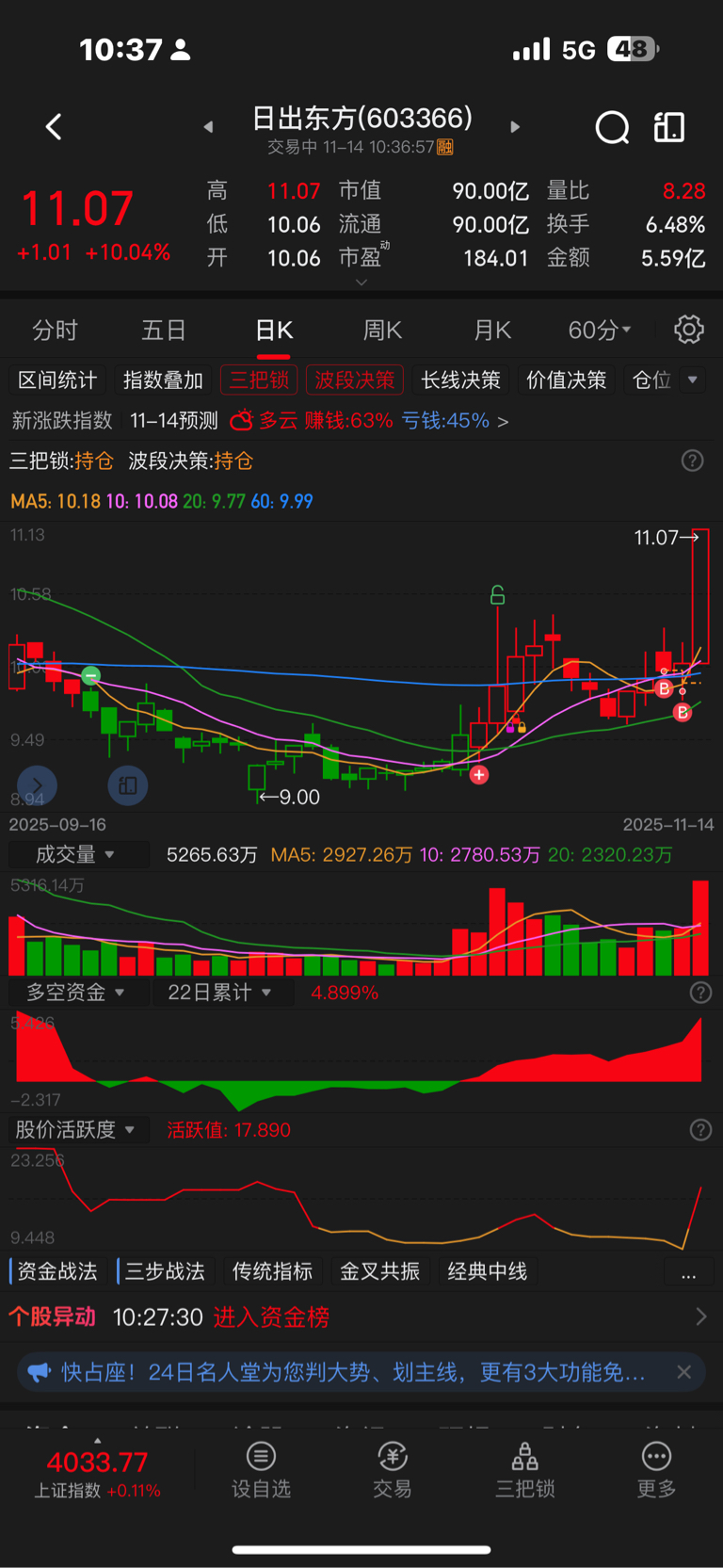 $日出东方(SH603366)$ 前天买了半仓,昨天开盘跌到-2全仓干进去了!今天果然没让我失望!