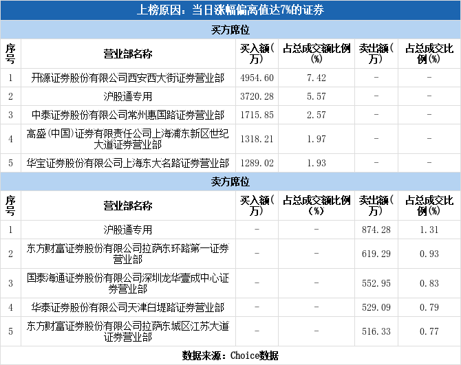 今日龙虎榜单上出现了沪股通的身影,占据了买二、卖一的位置,净买入2845.99万元,占当日成交总额的4.26%,是获沪股通净买额最高的个股。除此之外沪股通还参与到了兆易创新、国新能源、三元股份等6只个股中,其中2家呈现沪股通净买入,获净买入最多的是国新能源,净买额为2558.25万元;4家呈现沪股通净卖出,遭净卖出最高的为兆易创新,净卖额为8.04亿元。