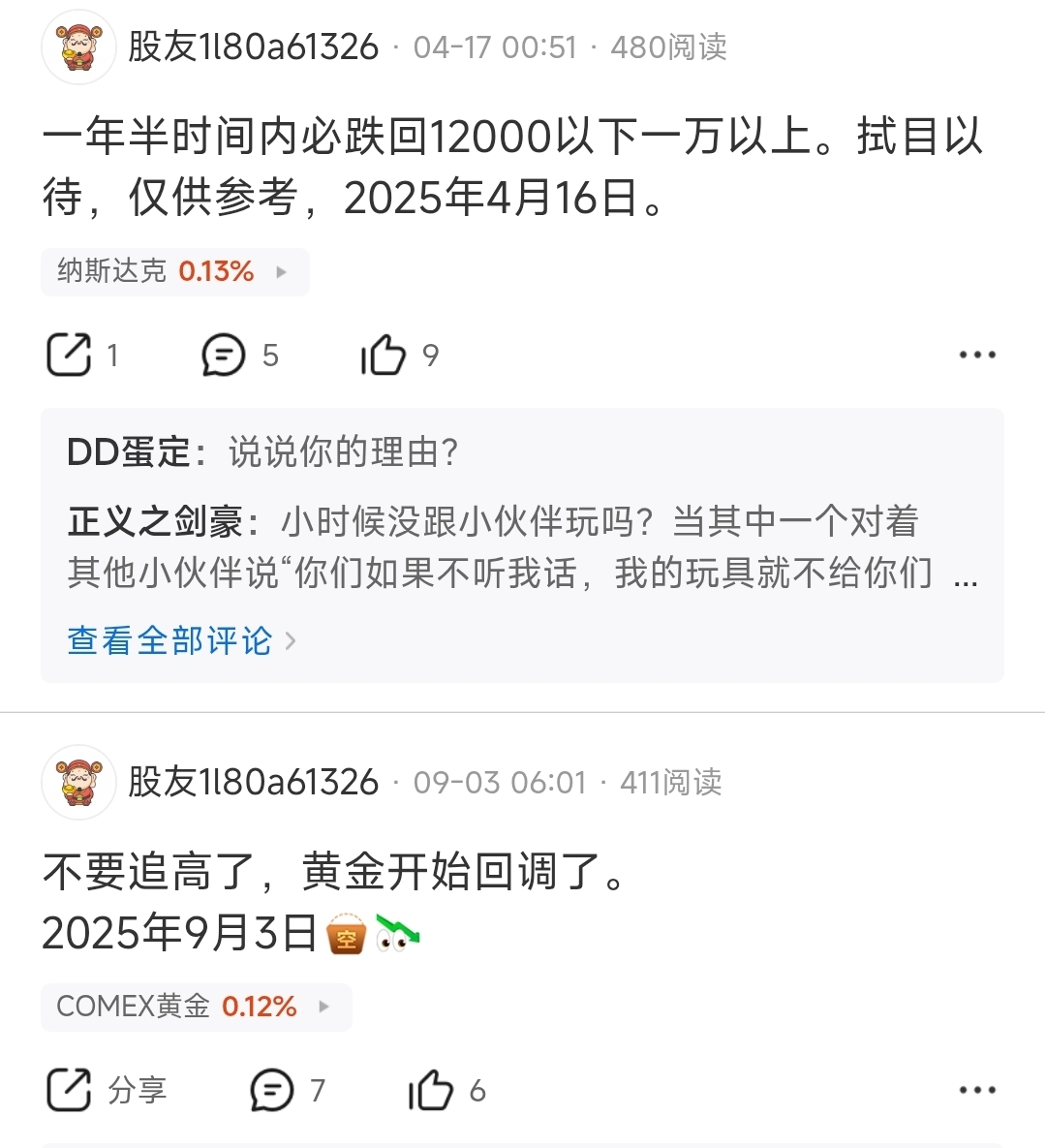 $日出东方(SH603366)$ 这就是个铁憨憨,大家别当真,哈哈哈哈。从它说纳指要到12000以下后,现在已经23576了。从它说黄金别追高后,现在也比9月3日高出16%了。这个憨憨就只会看以往数据,对未来判断基本没对过。