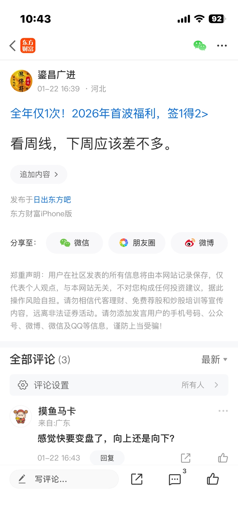 温馨提示: 1.根据《证券法》规定,禁止编造、传播虚假信息或者误导性信息,扰乱证券市场;2.用户在本社区发表的所有资料、言论等仅代表个人观点,与本网站立场无关,不对您构成任何投资建议。用户应基于自己的独立判断,自行决定证券投资并承担相应风险。《东方财富社区管理规定》