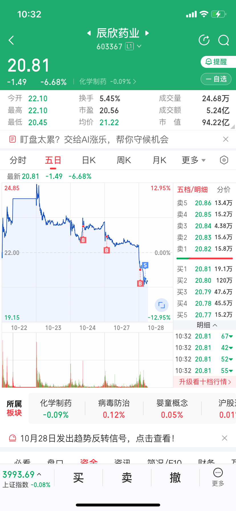 $辰欣药业(SH603367)$ 周五进来,亏10多点 ,下午如果上升在接回来,下跌明天再入