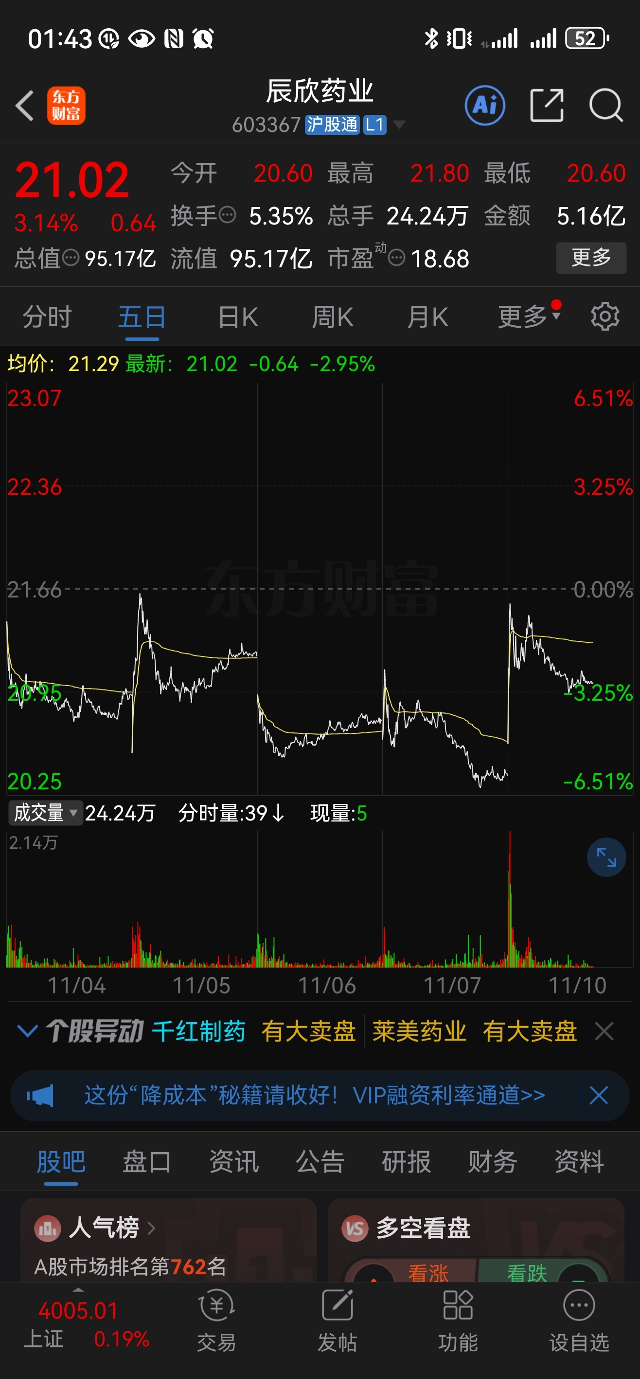 $辰欣药业(SH603367)$ 连着五个交易日都是开盘几分钟内冲高,回落一整天