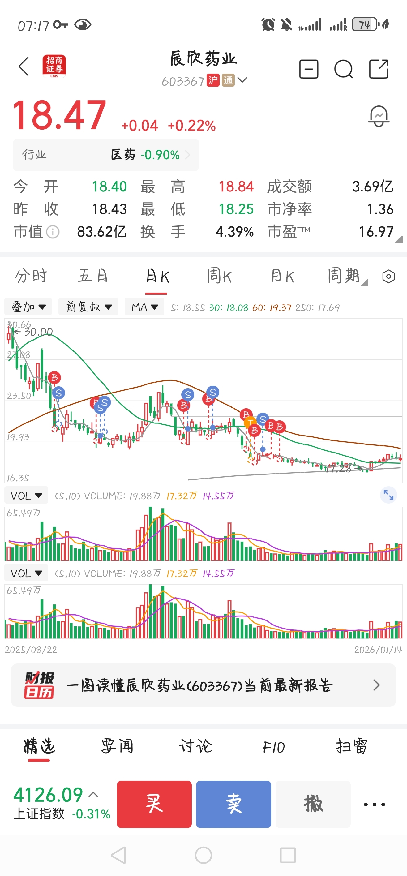 $辰欣药业(SH603367)$ 医药很久没火了,这个位置我一直没动,拿着1.5成仓位,没加仓,也没减仓。短期我是看震荡,对他期望值不高,但是这样的股票,他总会有一天给我惊喜。也希望各位股东想想,现在卖他,你能换什么股,能保证一定比辰欣赚得多吗?还是要多给一些耐心!#炒股日记#
