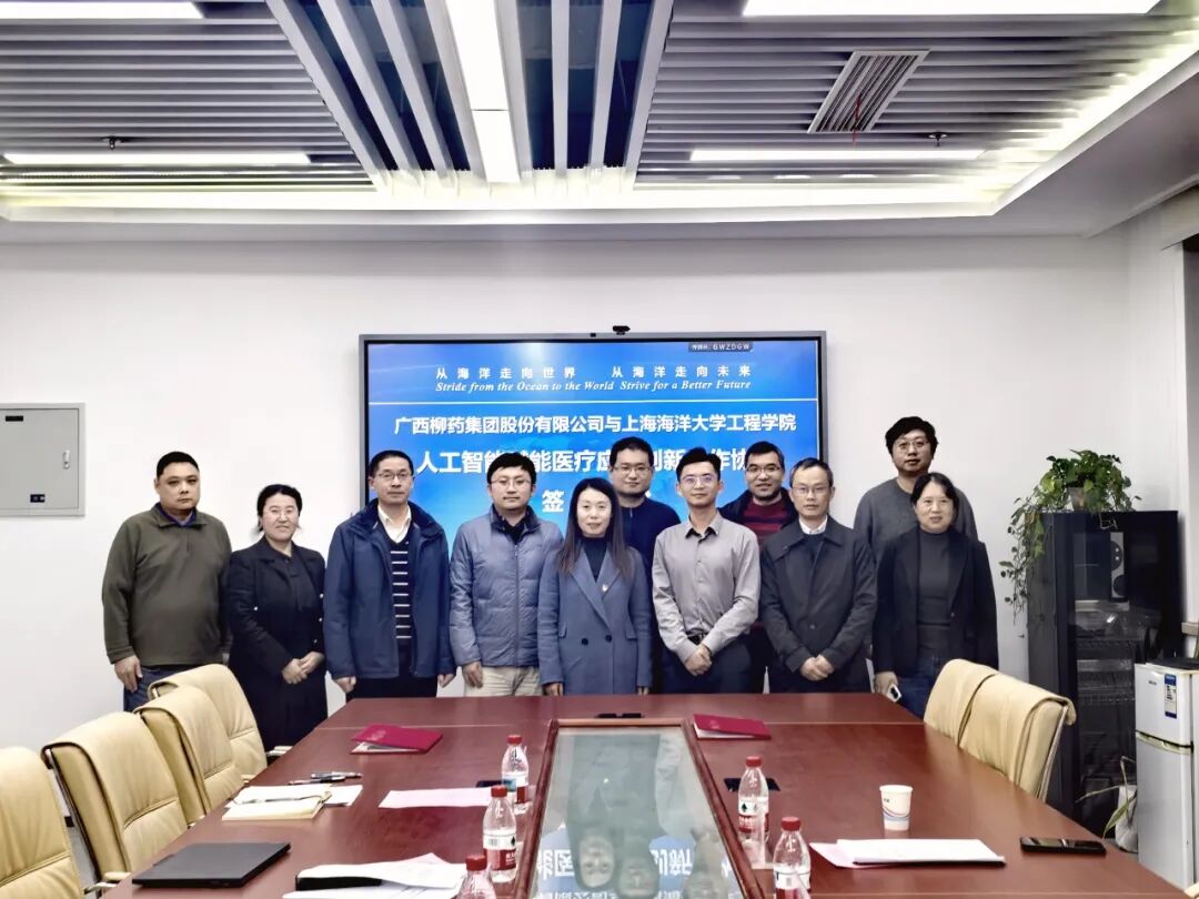 上海海洋大学科技处副处长许竞翔、工程学院副院长刘雨青、工程学院党委副书记李志强及相关教师代表,柳药集团信息管理中心部长史永桥等共同出席并见证签约。