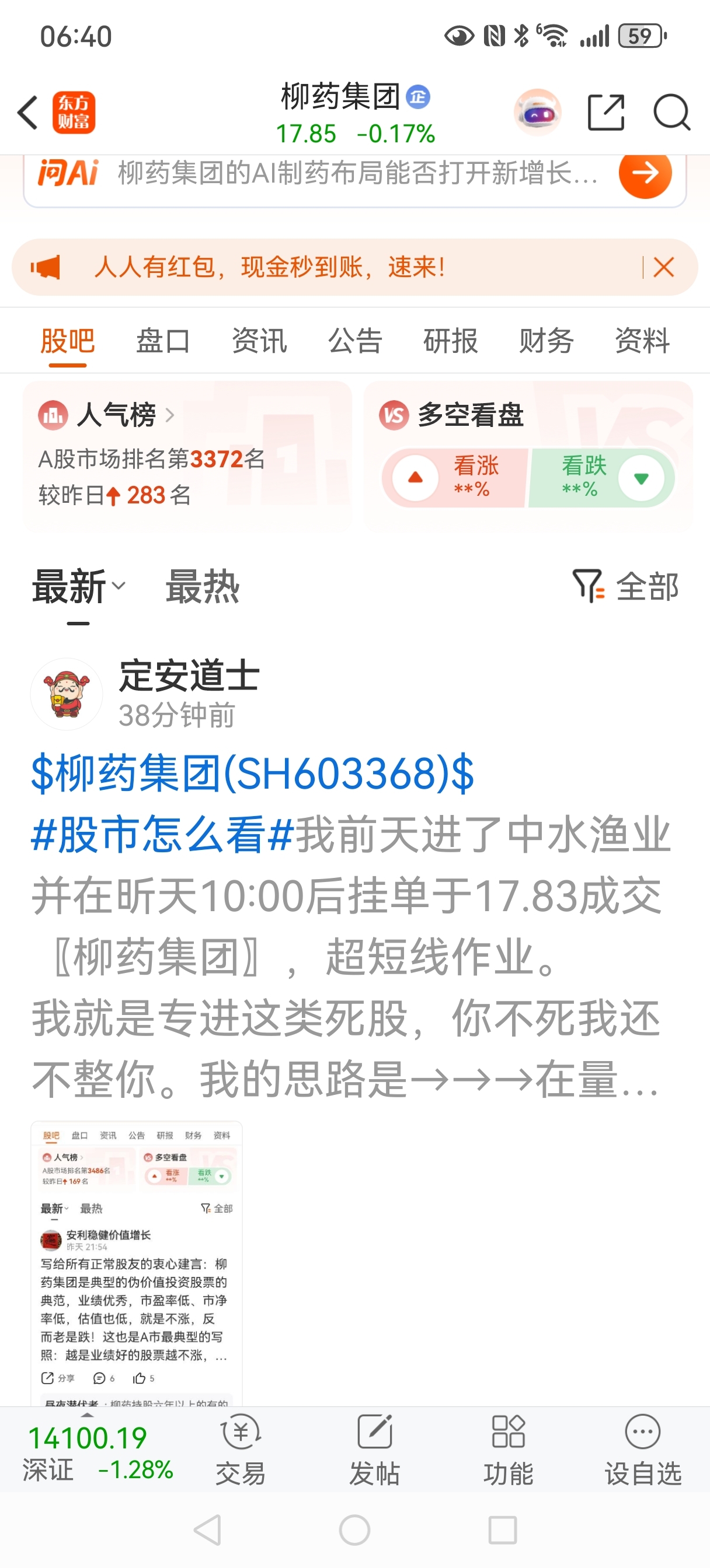 #强势机会# 柳药就属集弱转强之际的强势股。《对这类股的操作原则是》:不与凡夫俗子合污,不与道岸貌然的伪君子作“长期资本“合作的玫瑰梦;只有这样才能不被梁文疯量化给白斩吃了。具体避险供一个绝招:在非牛市前提下,《个股出大量就是 顶》!→→→是顶你〖不出〗就有病啦