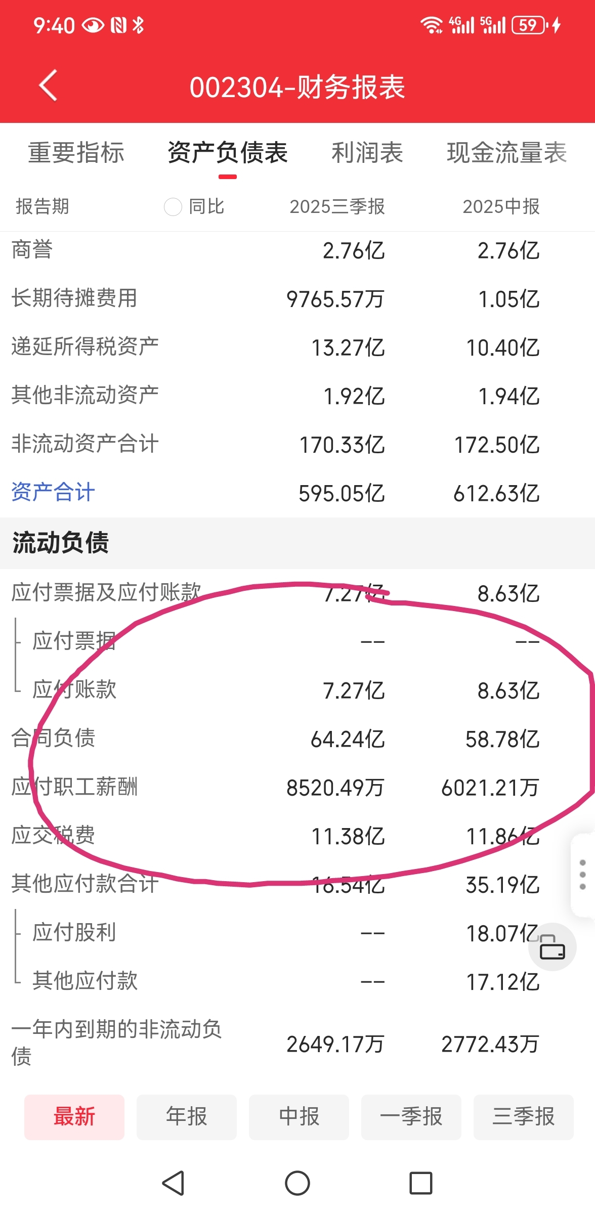 今世缘合同负债今年三季报5个亿,去年5个亿,洋河股份合同负债68亿,去年49亿,