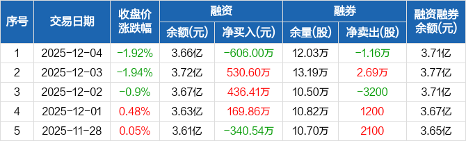 今世缘融资融券信息显示,2025年12月4日融资净偿还606万元;融资余额3.66亿元,较前一日下降1.63%
