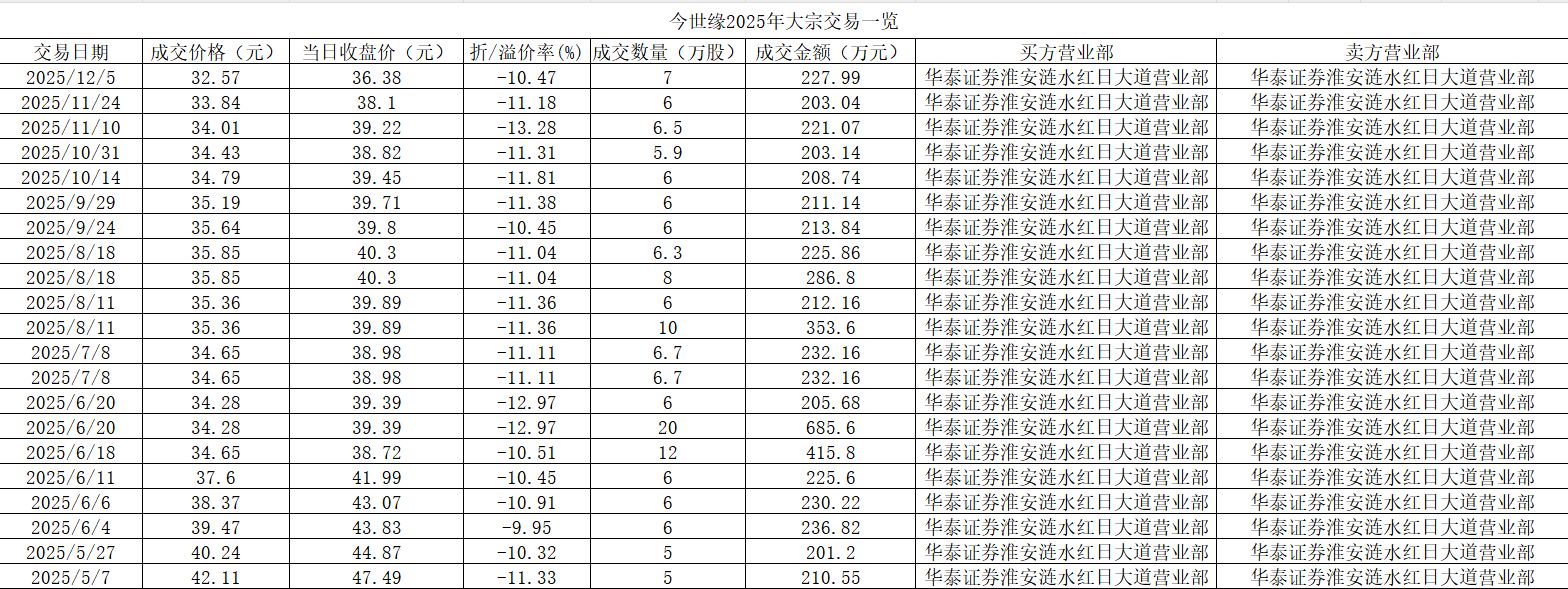 《每日经济新闻·将进酒》记者注意到,12月5日,今世缘发生一笔大宗交易,该笔交易的买卖方均为华泰证券股份有限公司淮安涟水红日大道证券营业部,该笔交易成交量为7万股,成交金额227.99万元,大宗交易成交价为32.57元,相对于12月5日收盘价折价10.47%。