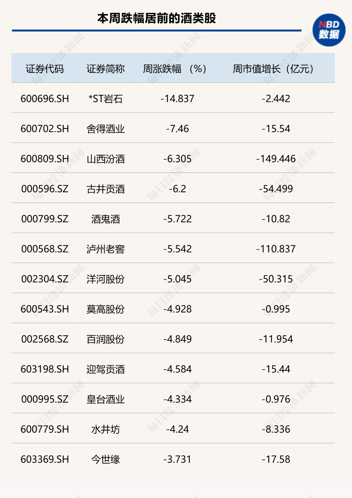 当沪指重返3900点之时,白酒行业却再度“逆行”走低,Wind白酒指数本周跌幅达到3.62%,跌幅排在所有行业前列。个股方面,*ST岩石、舍得酒业、山西汾酒以及古井贡酒等7只个股周跌幅超过5%,其中,*ST岩石已经连续两周跌幅超过10%,退市风险进一步加剧。今世缘、水井坊、皇台酒业以及迎驾贡酒周跌幅也超过3.62%,跑输Wind白酒指数。