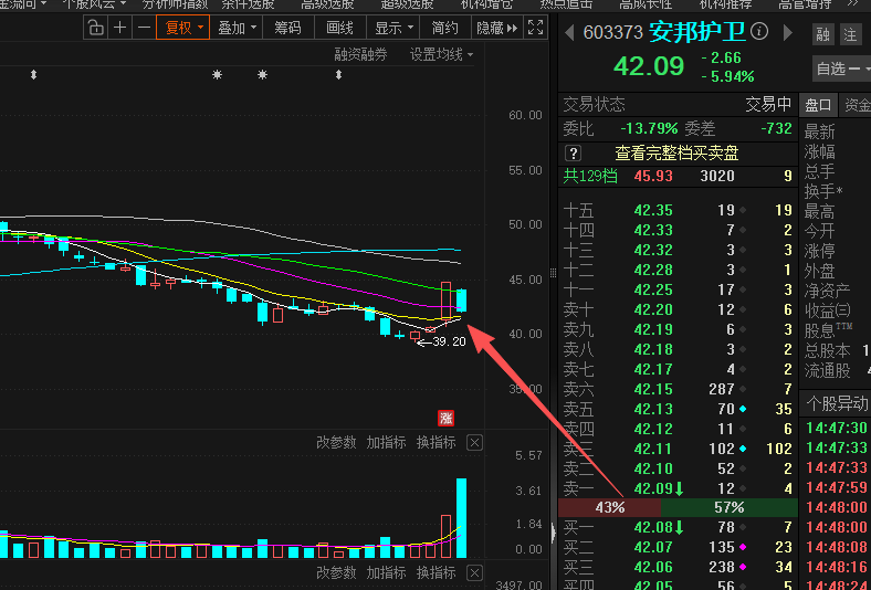 好久没有盘中发帖了,现在闲着没事,就展示一些短线思路和手法,现在价格42.08左右。我入场一些。博弈明天反抽一些的溢价!大家怎么看?