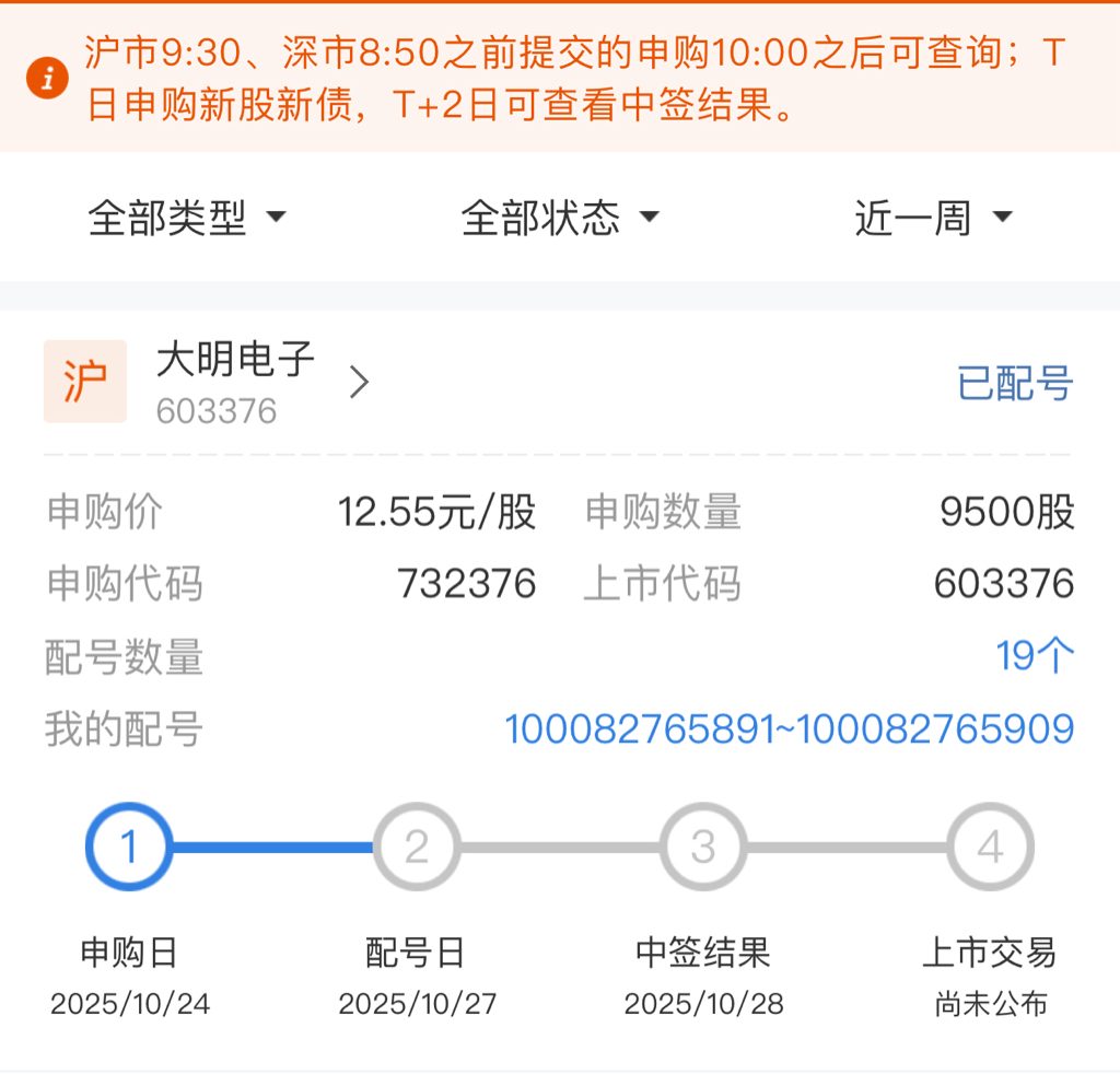 $大明电子(SH603376)$ 打从娘胎里面打新从来都没中过。