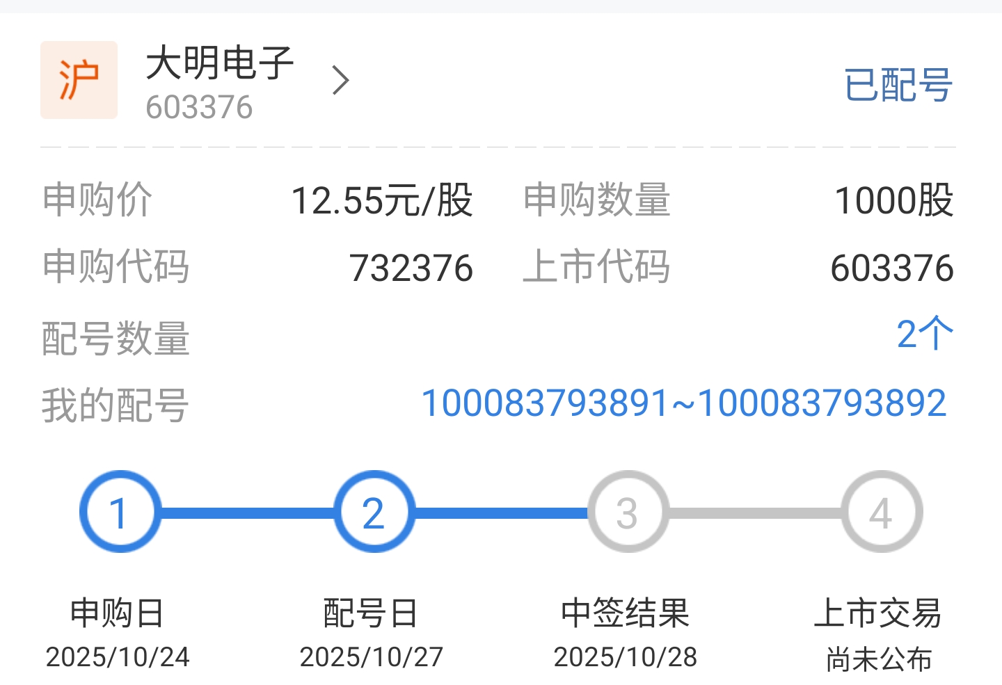 $大明电子(SH603376)$ 还没中过新股,求求了