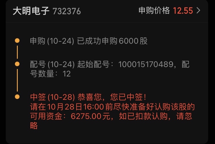 $大明电子(SH603376)$ 时隔一年再次中签!冲