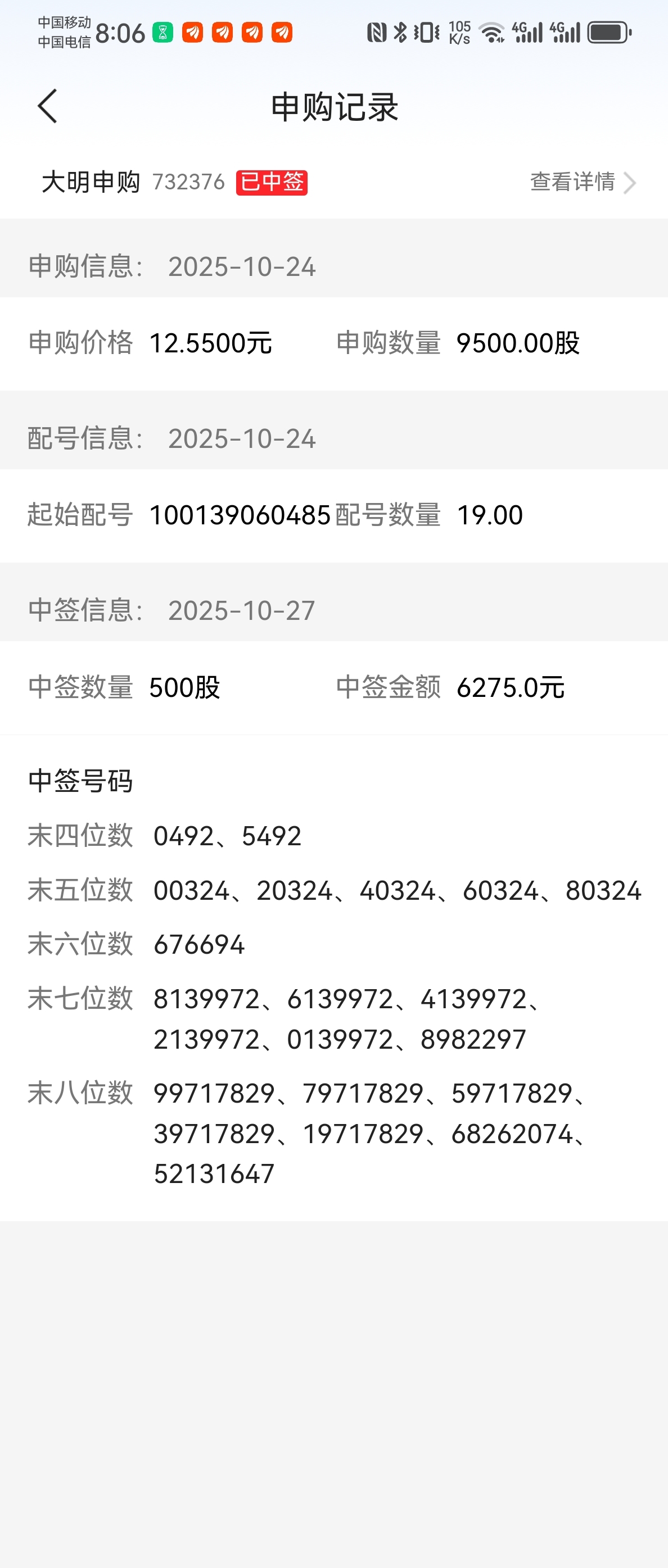 查看了一下申购时间,好像每次都是这个时间中签概率高。而且这应该是一个肉签,大明,