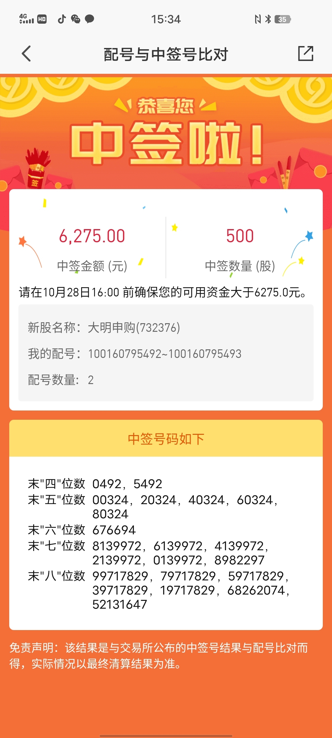 $大明电子(SH603376)$ 来来来,两个号中签了什么运气