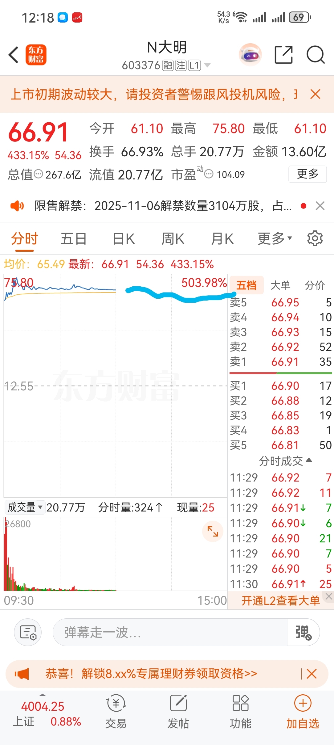 $N大明(SH603376)$ 上午半小时爆量,十点后缩量下跌。下午大概率就是逐步跌破66,65,64,收盘看看60能不能保住,中签户绝大部分都还在,早上散户巨量买进