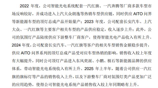公司顶灯产品进入小鹏新能源品牌的供应体系,带动智能光电系统收入有所上升。