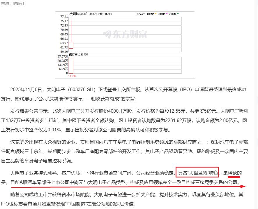 大明王朝:A股“智驾第一股”“智驾独角兽”,具备“大盘蓝筹”特色。更稀缺的是,目前A股无可比对对象,目前A股汽车零部件上市公司中尚无与大明电子产品类型、构成及应用领域完全一致且构成直接竞争关系的公司。尾盘开小灶小玩1次新股,切勿跟风。