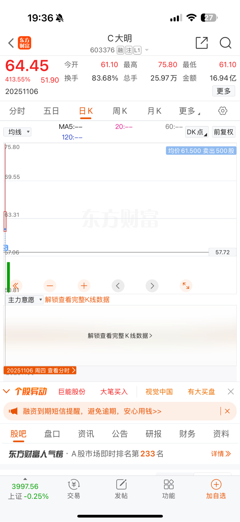 $C大明(SH603376)$ 拍大腿啊,61.5卖的,没有卖在最高点,行啊,知足常乐吧!